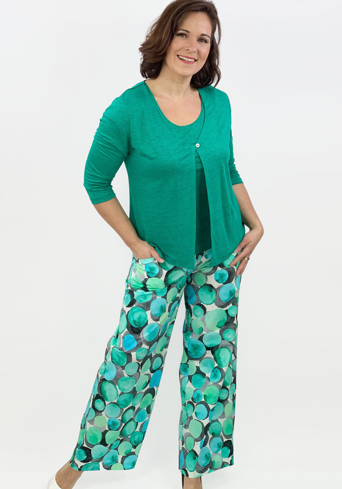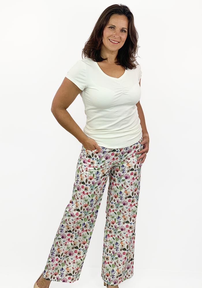 Die bequeme Marlenehose ist weiter geschnitten und umspielt die Figur. Am Bund befindet sich ein weicher Jerseybund, am Vorderteil sind Eingrifftaschen.